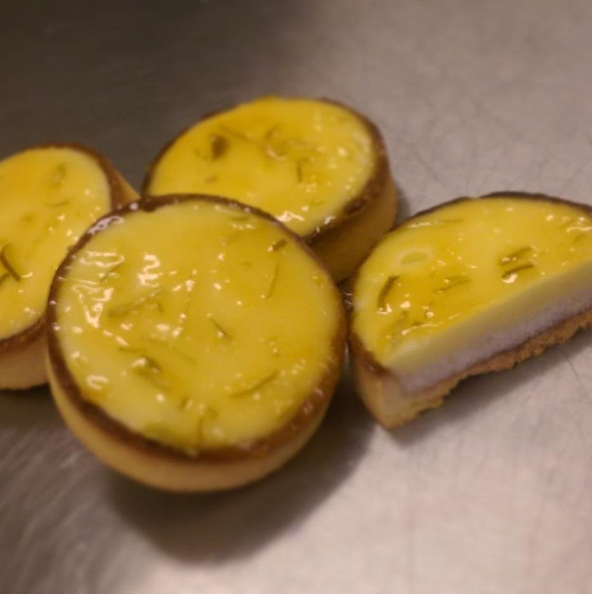 Deze tartelette is gevuld met geroosterde kokos, laagjes santen kokoscreme, kokosmelk en citroencrème en abrikoos-limoen glazuur.